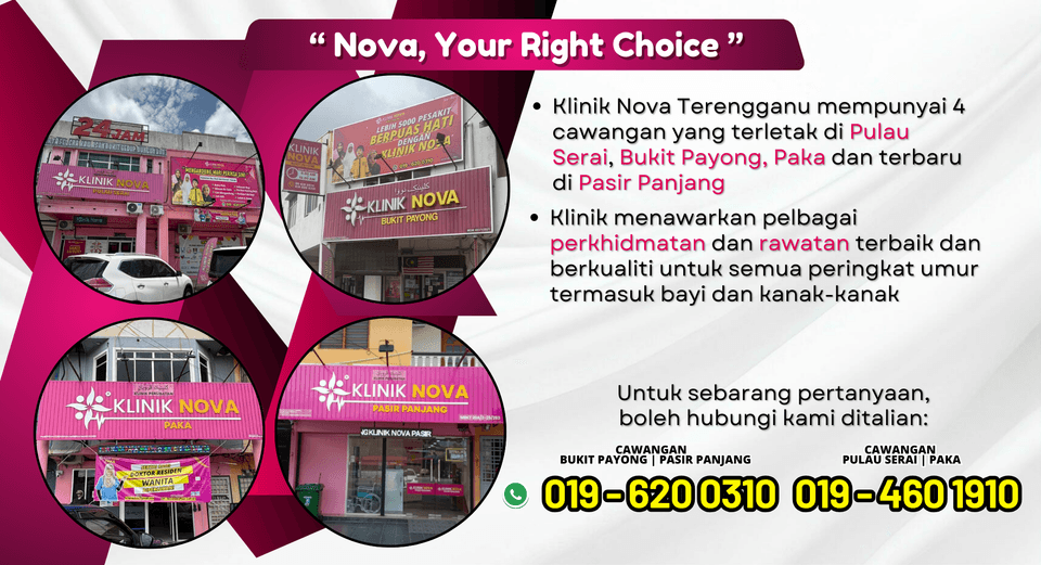 Dapatkan pelbagai perkhidmatan dan rawatan kesihatan untuk semua peringkat umur di cawangan Klinik Nova 24 Jam (Bukit Payong, Pulau Serai dan Paka) Boleh terus hubungi kami untuk sebarang pertanyaan lanjut atau ingin membuat temujanji bersama Doktor.